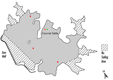 Marks of the course and rounding buoys will be yellow, blue or orange buoys located approximately as indicated on the map of the lake on the race information board. Sailing is strictly confined to those areas shown on the map. A course gate of two buoys, one coloured red and the other green, shall be positioned in the vicinity of the beach, which boats shall pass between at the commencement and completion of each lap of the course. If continuing on to a further lap, the boat shall round the appropriate mark of the course gate (depending on the hand of the course) and the passing through the course gate shall constitute both the completion of the previous lap and the commencement of the current lap.